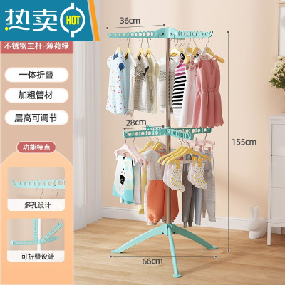 敬平婴儿晾衣架落地折叠多功能晒衣器新生儿童衣架宝宝尿布架毛巾架 [双层款绿色]不锈钢-双层7翅防风-可旋转升降 大