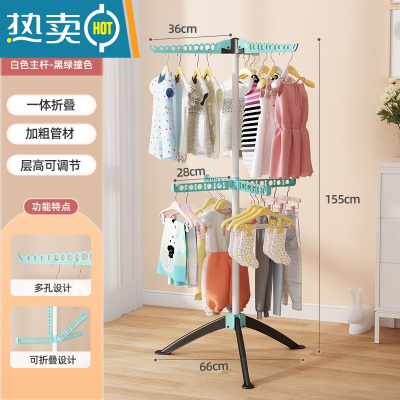 敬平婴儿晾衣架落地折叠多功能晒衣器新生儿童衣架宝宝尿布架毛巾架 [双层款黑绿]金属款-双层7翅防风-可旋转升降 大