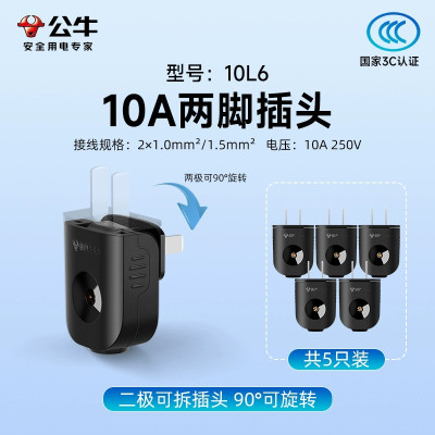 公牛(bull)GNT-10L6黑色可旋转插头5支装空调二脚10a电源电线3角大功率220v不带线工程