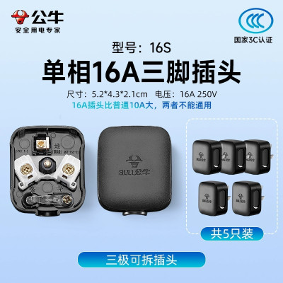 公牛(bull)GNT-16S黑色插头5支装空调三脚16a三孔电源电线3角大功率220v不带线工程