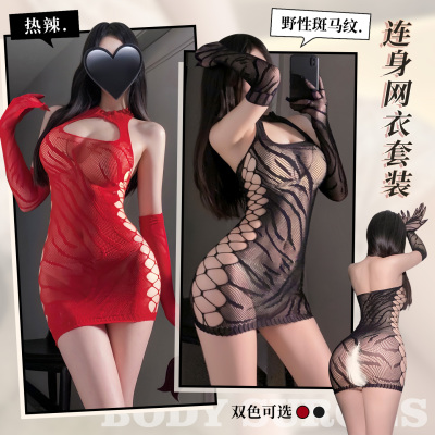 热辣野性斑马纹连身网衣套装镂空透视透明漏肉性感情趣内衣7401