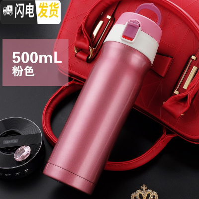 三维工匠成人弹跳便携保温杯水壶316不锈钢水杯子男女士情侣车载茶杯 粉色佳人