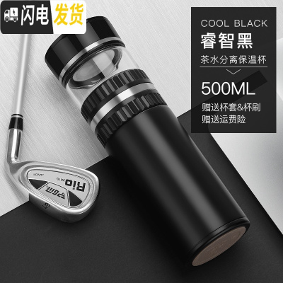 三维工匠保温杯316不锈钢商务男女士便携大容量车载茶水分离泡茶水杯 睿智黑500(杯刷杯套)