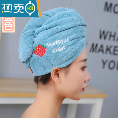 敬平干发帽吸水浴帽洗头发速干刺绣毛巾包头女加厚成人长发擦头巾 湖蓝色-草莓双层加厚-品质款