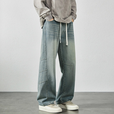 潮牌男装秋冬宽松直筒港风牛仔裤男基础款百搭多色松紧水洗拖地裤