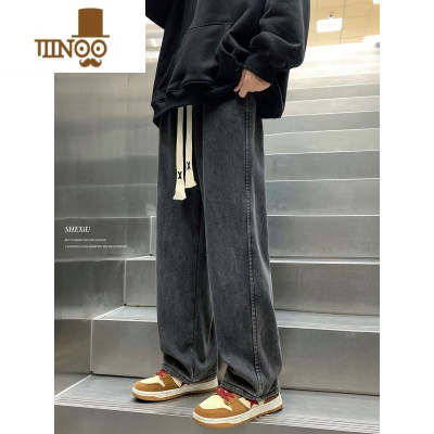 YANXU复古阔腿牛仔裤男宽松直筒百搭2023夏季新款高街松紧腰休闲长裤子