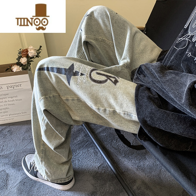 YANXU直筒刺绣牛仔裤男潮牌休闲日系复古痞帅水洗美式青少年长裤子