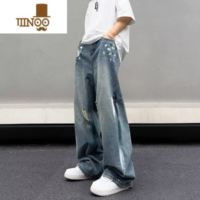YANXU水洗破洞牛仔裤男夏季设计感小众宽松阔腿直筒拖地裤美式vibe裤子