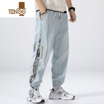 YANXU牛仔裤男复古拼接小熊设计感高街夏季工装裤子潮牌薄款九分束脚裤