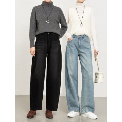 年冬季新款植绒加厚牛仔弯刀裤女高腰宽松香蕉长裤