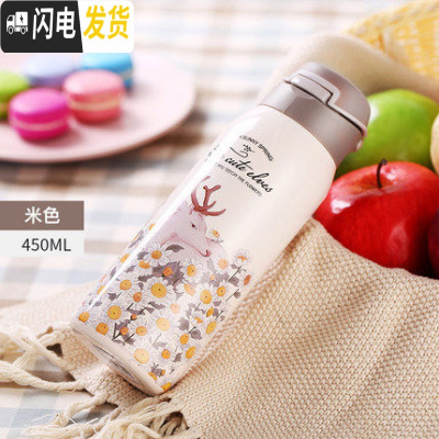 三维工匠带吸管式的保温杯大人ins原宿风简约少女学生便携网红韩版水杯子 花海米色-450