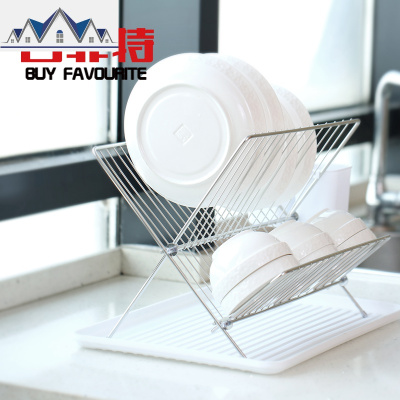 304不锈钢折叠碗碟架双层厨房置物X型沥水架免装带接水盘收纳架 三维工匠