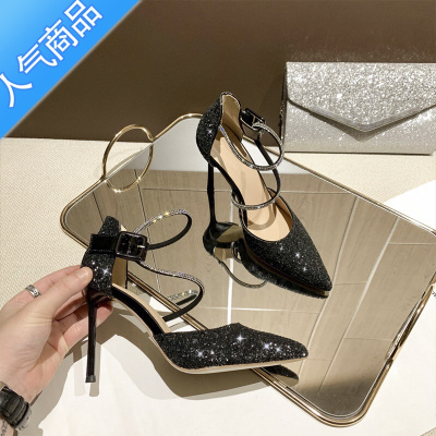 聚范尖头细跟高跟鞋女法式水钻方扣气质单鞋包头凉鞋女夏配裙子