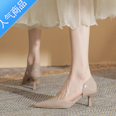 SUNTEK2023新款网红气质春秋季设计感漆皮单鞋女秋冬裸色尖头高跟鞋细跟