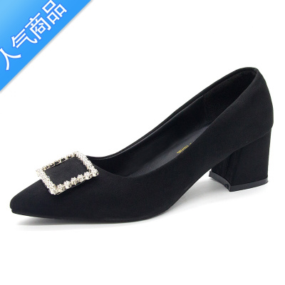 SUNTEK粗跟单鞋女2023春季新款百搭中跟水钻尖头鞋子职业黑色绒面高跟鞋