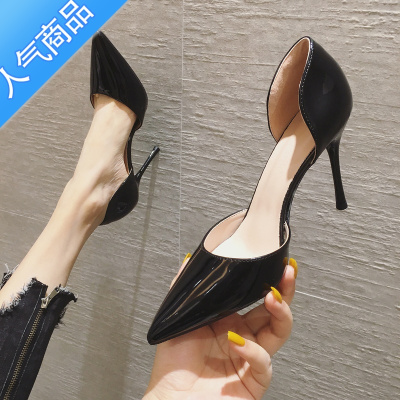 SUNTEK漆皮黑色工作单鞋女2023春季新款时尚尖头中空性感浅口细跟高跟鞋