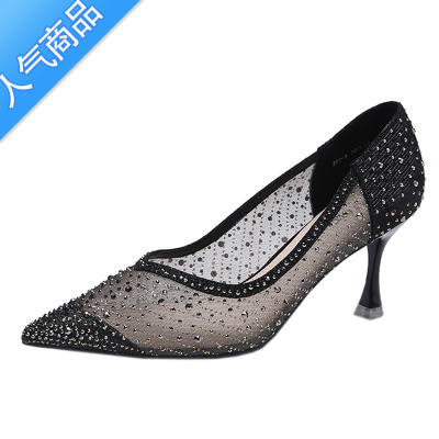 SUNTEK水晶婚鞋香槟色高跟鞋透气网纱水钻时尚尖头细跟中跟单鞋女夏2023
