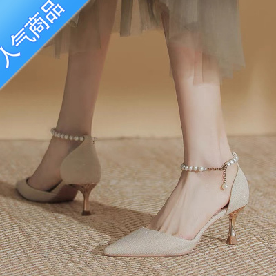 SUNTEK一字扣高跟鞋女细跟婚鞋女2023年新款夏配裙珍珠气质尖头单鞋