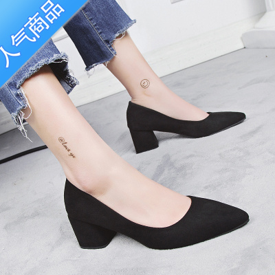 SUNTEK黑色高跟鞋子2023春季新款百搭工作鞋女韩版尖头浅口绒面粗跟单鞋