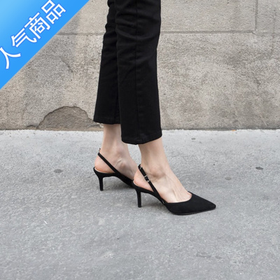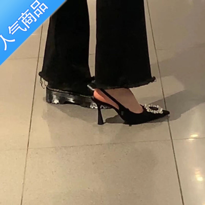 SUNTEK2023年春款法式后绊带黑色尖头高跟鞋水钻方扣细跟小众配裙子单鞋