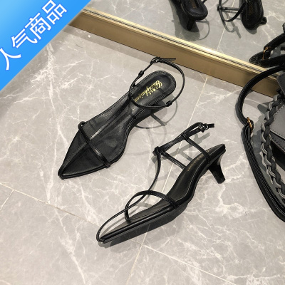 SUNTEK女款法式一字扣带中高跟鞋小猫跟尖头小众设计露趾十字细带凉鞋女