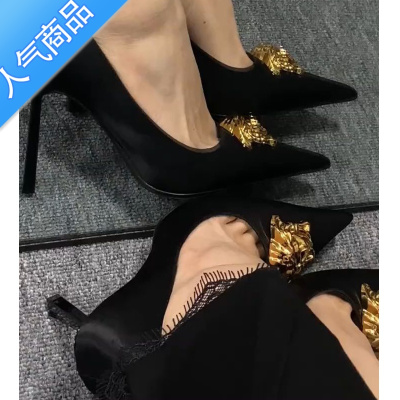聚范黑色高级亮片新款尖头浅口亮片蝴蝶结高跟鞋女细跟珍珠一字带单鞋