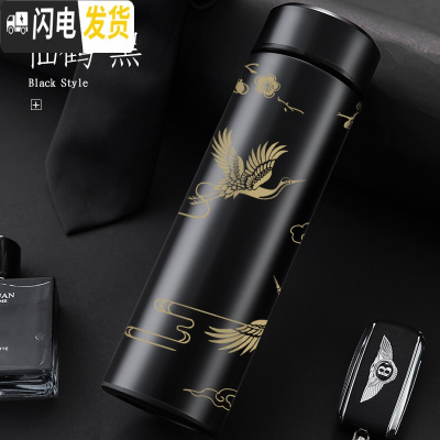 三维工匠保温杯男大容量304不锈钢 女学生茶杯车载保温水壶智能便携水杯子 仙鹤·黑