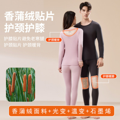 10A石墨烯羊毛护膝护颈香蒲绒贴片保暖内衣套装男女秋衣裤