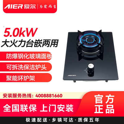 AIER爱尔燃气灶JZT-1220天然气5.0kW大火力台嵌两用防爆钢化玻璃面板可拆洗保洁炉头聚能环炉架