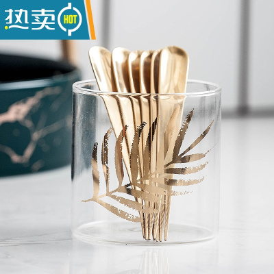 敬平北欧水果叉签果插玻璃套装不锈钢创意时尚家用甜品叉点心叉蛋糕叉 金叶玻璃罐一个+6根圆圆叉牙签