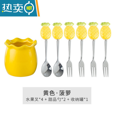 敬平304水果叉子儿童安全勺子卡通不锈钢点心小叉可爱熊猫水果叉套装 黄色菠萝4叉2勺1罐 SUS304牙签