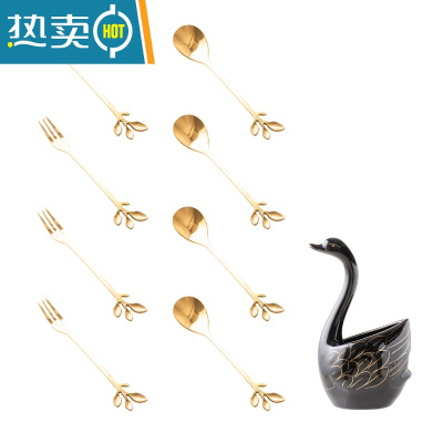 敬平家用时尚天鹅水果叉套装创意不锈钢水果叉子可爱点心叉甜品小叉签 黑天鹅金树叶叉勺(4叉4勺)牙签