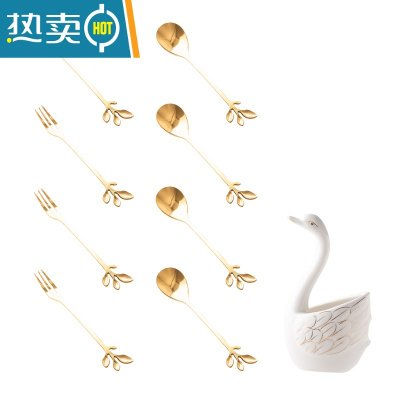 敬平家用时尚天鹅水果叉套装创意不锈钢水果叉子可爱点心叉甜品小叉签 白天鹅金树叶叉勺(4叉4勺)牙签
