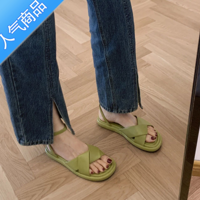 SUNTEK法式复古时尚平底一字带凉鞋女鞋子2023夏季新款仙女风学生罗马鞋