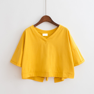 纯色后背拼接开叉V领宽松高腰短款上衣女学生绑带短袖T恤女装