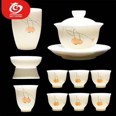 MULTIPOTENT整套功夫茶具套装中国白羊脂玉瓷素烧三才盖碗套组事事如意