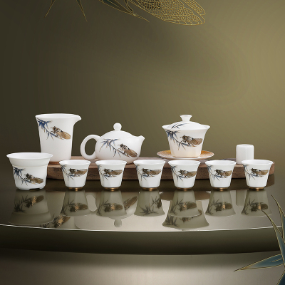 MULTIPOTENT整套功夫茶具中国白羊脂玉瓷套组青铜浮雕11头精美伴手礼盒套装