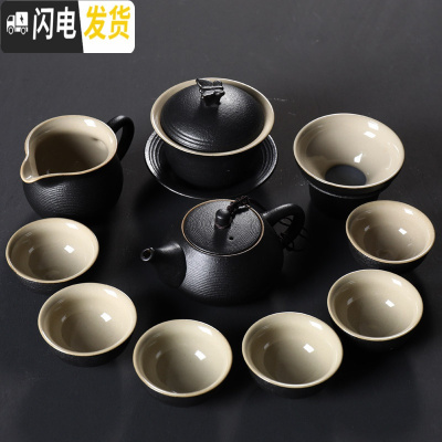 三维工匠茶具套装家用简约日式黑陶功夫茶具陶瓷茶壶茶杯黑乌金石茶盘 10头螺纹黑陶茶具