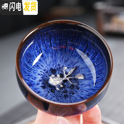 三维工匠镶银建盏茶杯陶瓷窑变天目杯十二生肖主人杯单杯功夫茶具品茗杯 16镶银窑变杯-金鱼(2019款)