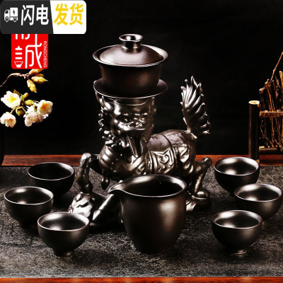 三维工匠陶瓷功夫茶具套装家用懒人泡茶半全自动出水石磨冲茶器茶壶茶杯 自动茶具[麒麟]黑禅