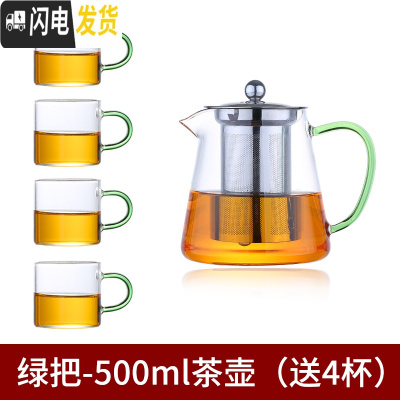 三维工匠加厚 耐热玻璃茶壶茶具 透明不锈钢泡茶壶家用可高温玻璃茶壶套装 绿把-500茶壶(送4杯)