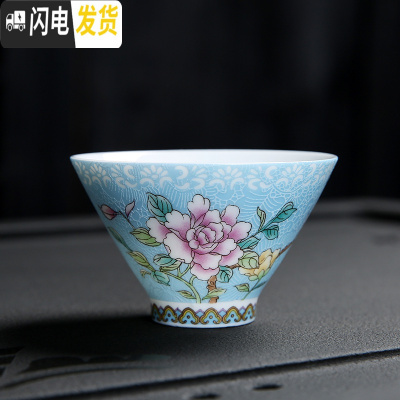 三维工匠景德镇扒花主人杯陶瓷茶杯单个日式茶盏描金斗笠杯功夫茶杯礼盒装 牡丹花(天空蓝)