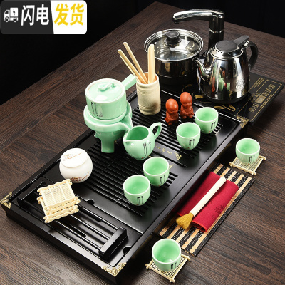 三维工匠整套陶瓷功夫茶具套装办公家用简约茶台全自动电热炉实木茶盘 马到成功分体黑色冰裂茶具套装 23件