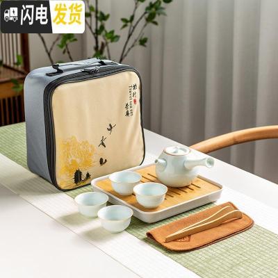三维工匠便携旅行茶具一壶四杯功夫茶具套装小套收纳包装带茶盘日式快客杯 汝窑茶具一壶四杯+密胺四方盘[白色]+旅行包