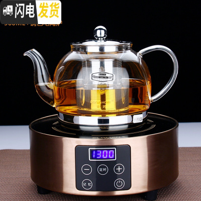 三维工匠加厚可高温煮茶壶 玻璃茶壶 耐热不锈钢网 黑茶泡茶壶 电陶炉套装 09款900+触屏铜色电陶炉送4杯茶具