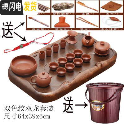三维工匠茶盘实木整块单层功夫茶具长方形排水茶台茶海大号家用办公室 酸枝色双龙套装64X39X6