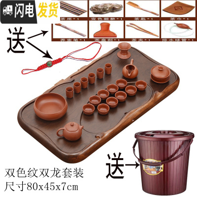 三维工匠茶盘实木整块单层功夫茶具长方形排水茶台茶海大号家用办公室 酸枝色双龙套装80X45X7