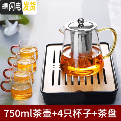 三维工匠加厚 耐热玻璃茶壶茶具 透明不锈钢泡茶壶家用可高温玻璃茶壶套装 黄把-750套装