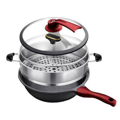 新丰腾麦饭石不粘锅炒锅无油烟平底锅炒菜锅家用多功能电磁炉燃气灶适用F1001炒锅32cm抗菌微压款(红色双盖)+豪华蒸笼