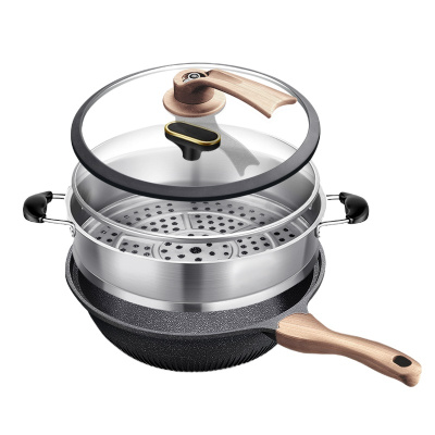 新丰腾麦饭石不粘锅炒锅无油烟平底锅炒菜锅家用多功能电磁炉燃气灶适用F1001炒锅32cm抗菌微压款(木纹双盖)+豪华蒸笼